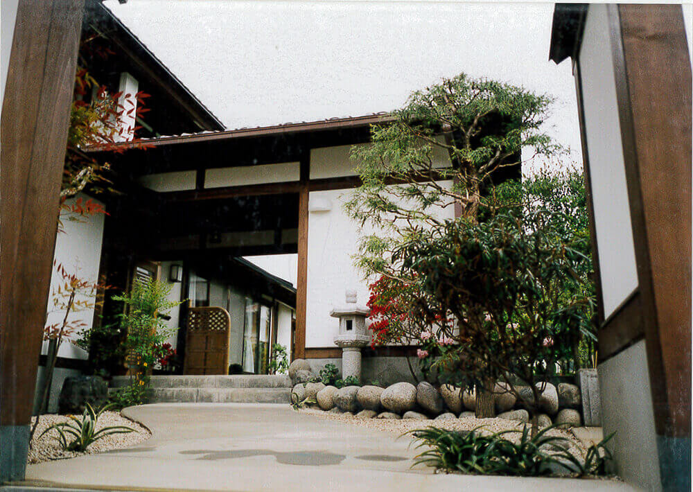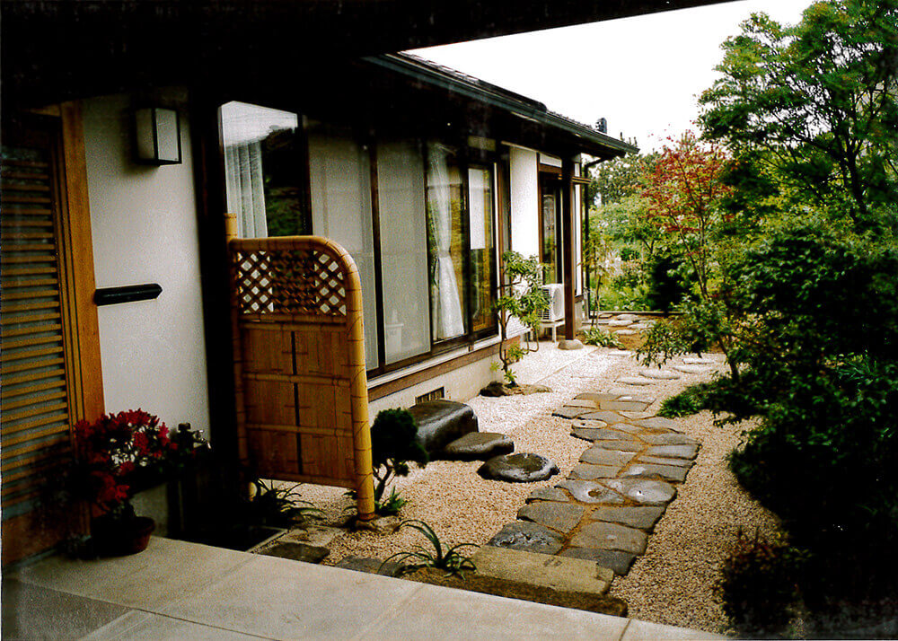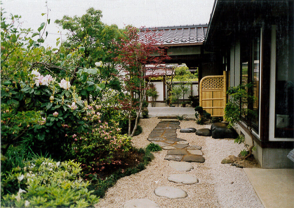 アプローチから庭へ続く敷石で整備した小道に沿って様々な植栽を施しました。邸宅の玄関に掛かる門を挟み、美しく整えたアプローチと、野趣あふれる庭との対比が特徴的です。