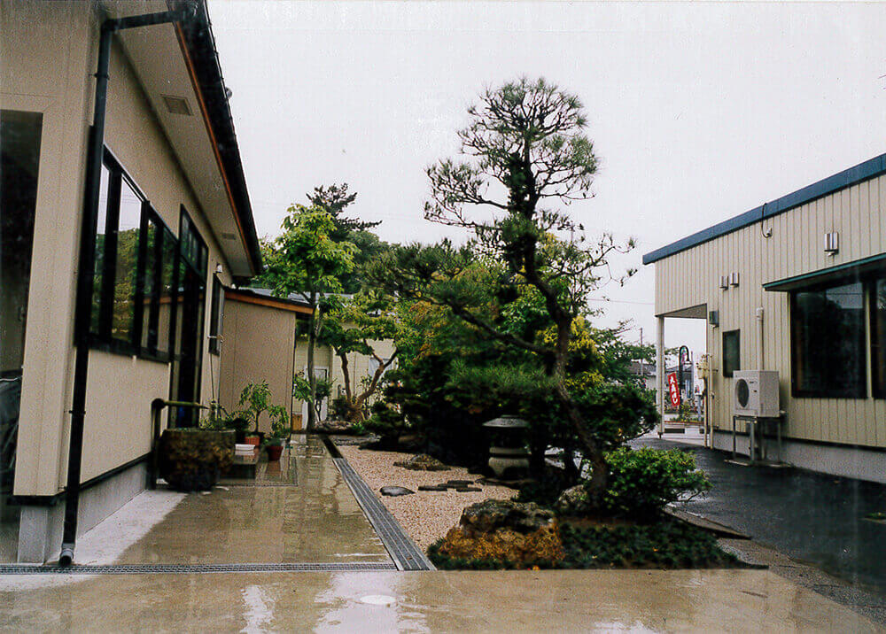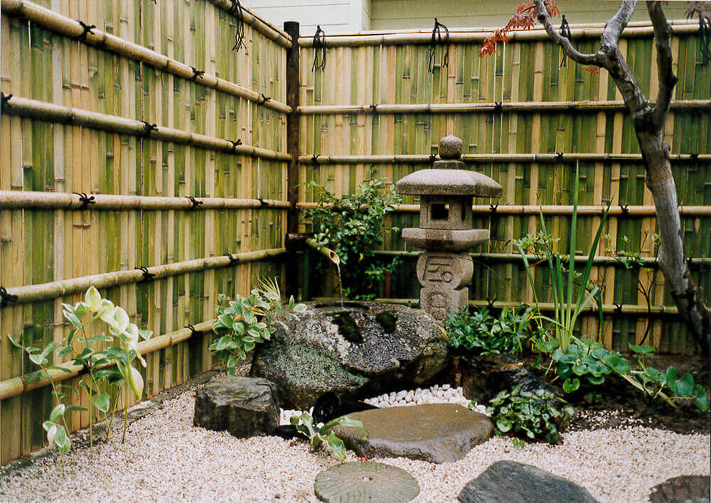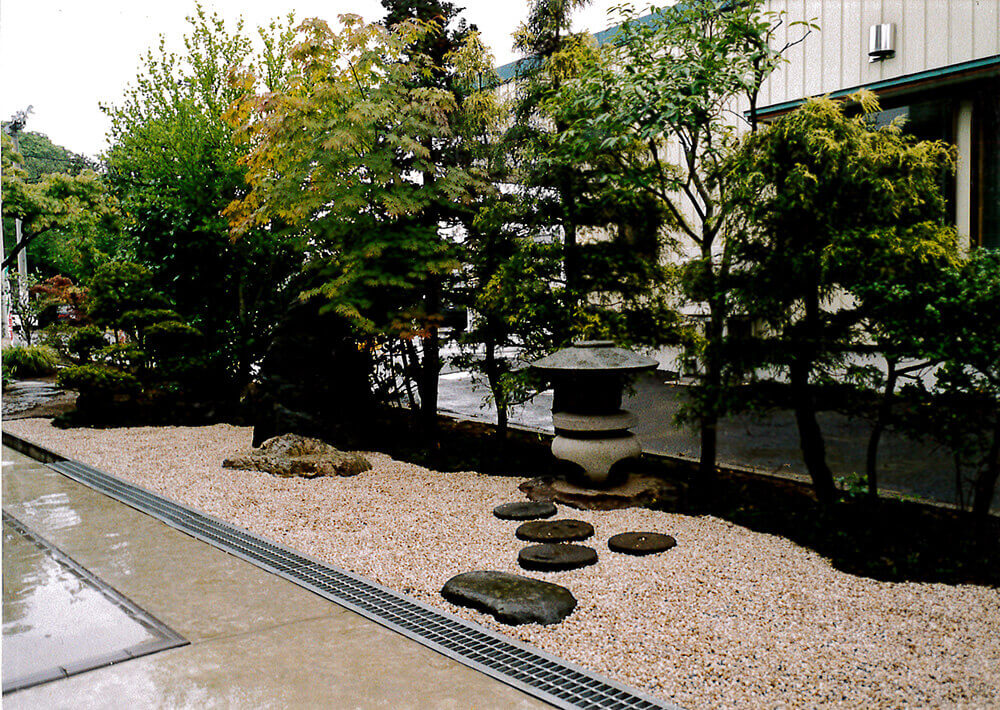 建物の外構に沿って、庭を整備した事例です。竹垣を豊富に取り入れ、建仁寺垣で囲んだり、玉袖垣で仕切りを付けるなど、装飾要素を生かした庭造りが特徴的です。
