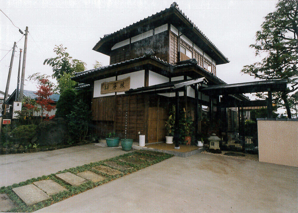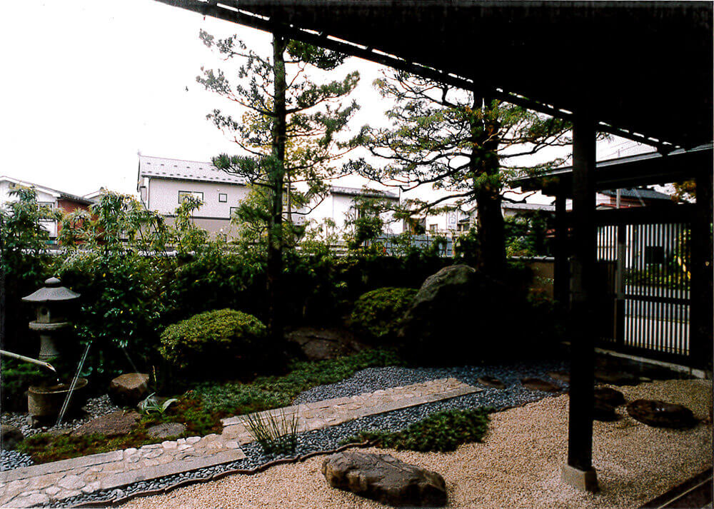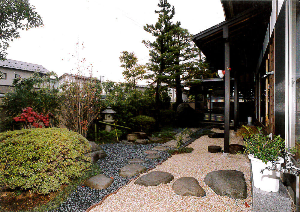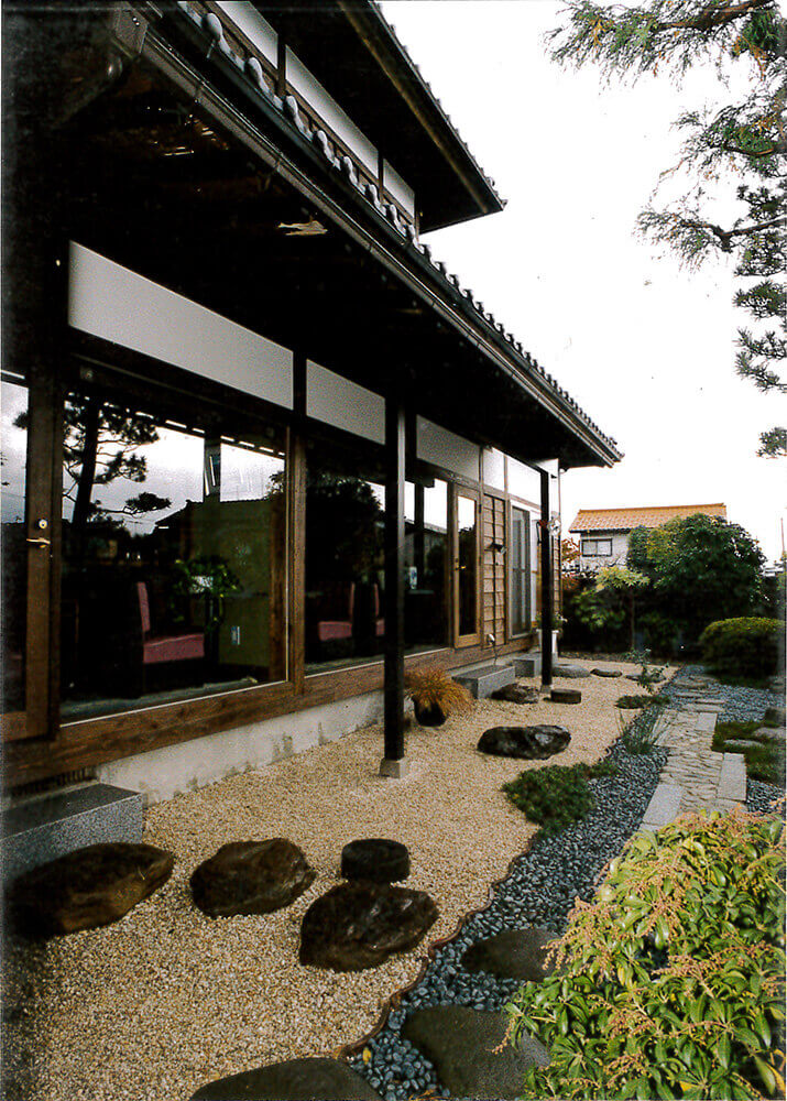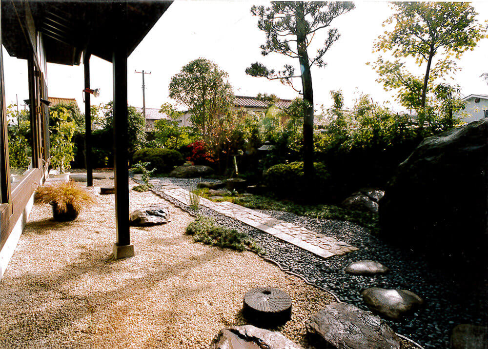 趣ある古民家を使用したカフェ空間から眺める和風庭園です。突き出した庇に合わせて見切りをつけて2色の砂利を敷き分け、奥行を感じさせながら庭の表情がより引き立つよう視覚的な工夫を取り入れています。