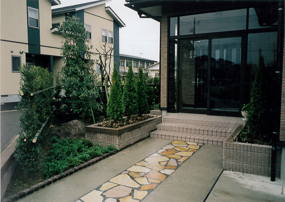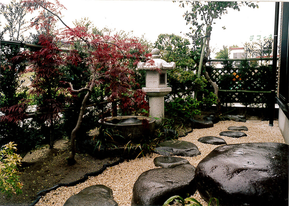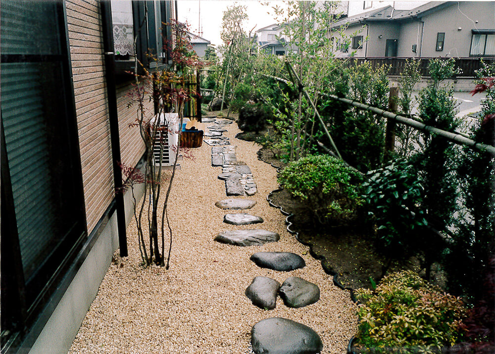 外構を中心に施工した事例です。玄関まわりや外周は建物の意匠を考慮して和洋折衷な雰囲気を出しつながら、庭は純和風に仕上げ、季節の移ろいを楽しめるよう施工しました。
